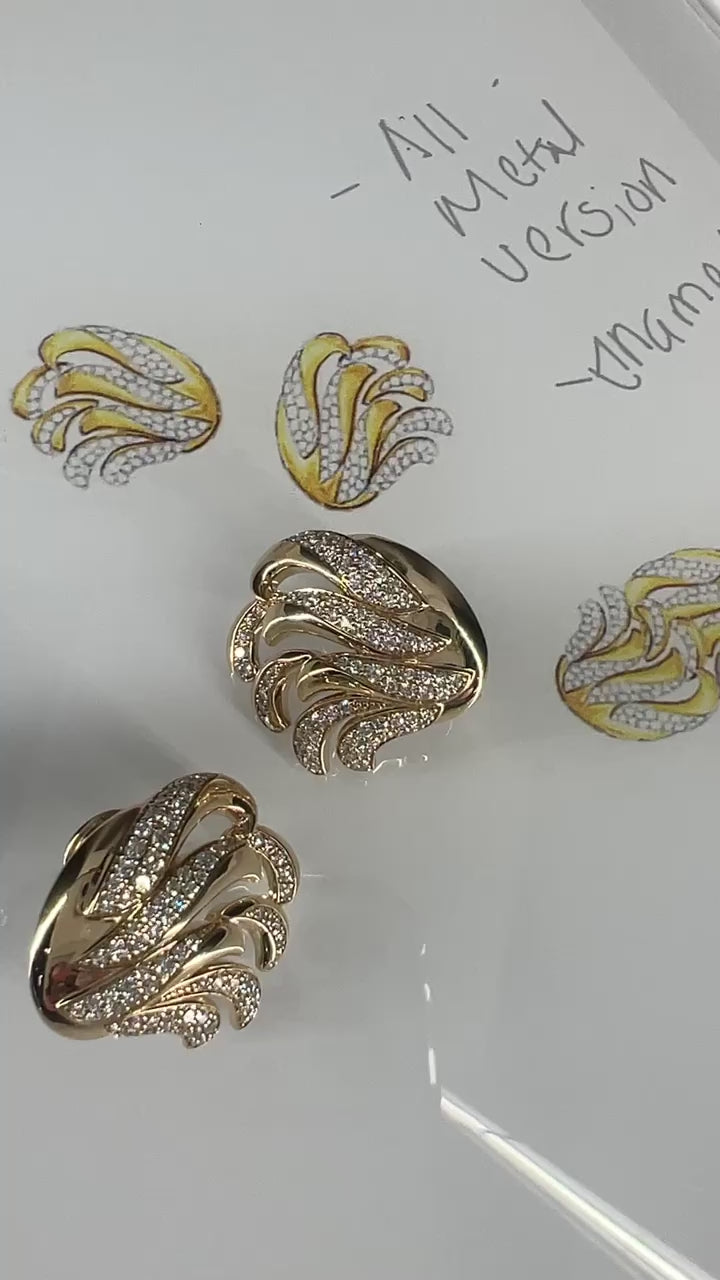These stunning Yellow gold and diamond earrings feature a cluster of glittering round diamonds arranged in a wave-like pattern. The 2.56 carats of diamonds are expertly set in a 18k yellow gold setting to ensure maximum sparkle and brilliance. These earrings are a beautiful statement piece that will add a touch of glamour and sophistication to any outfit. They are perfect for special occasions, weddings, or for adding a touch of elegance to your everyday look.